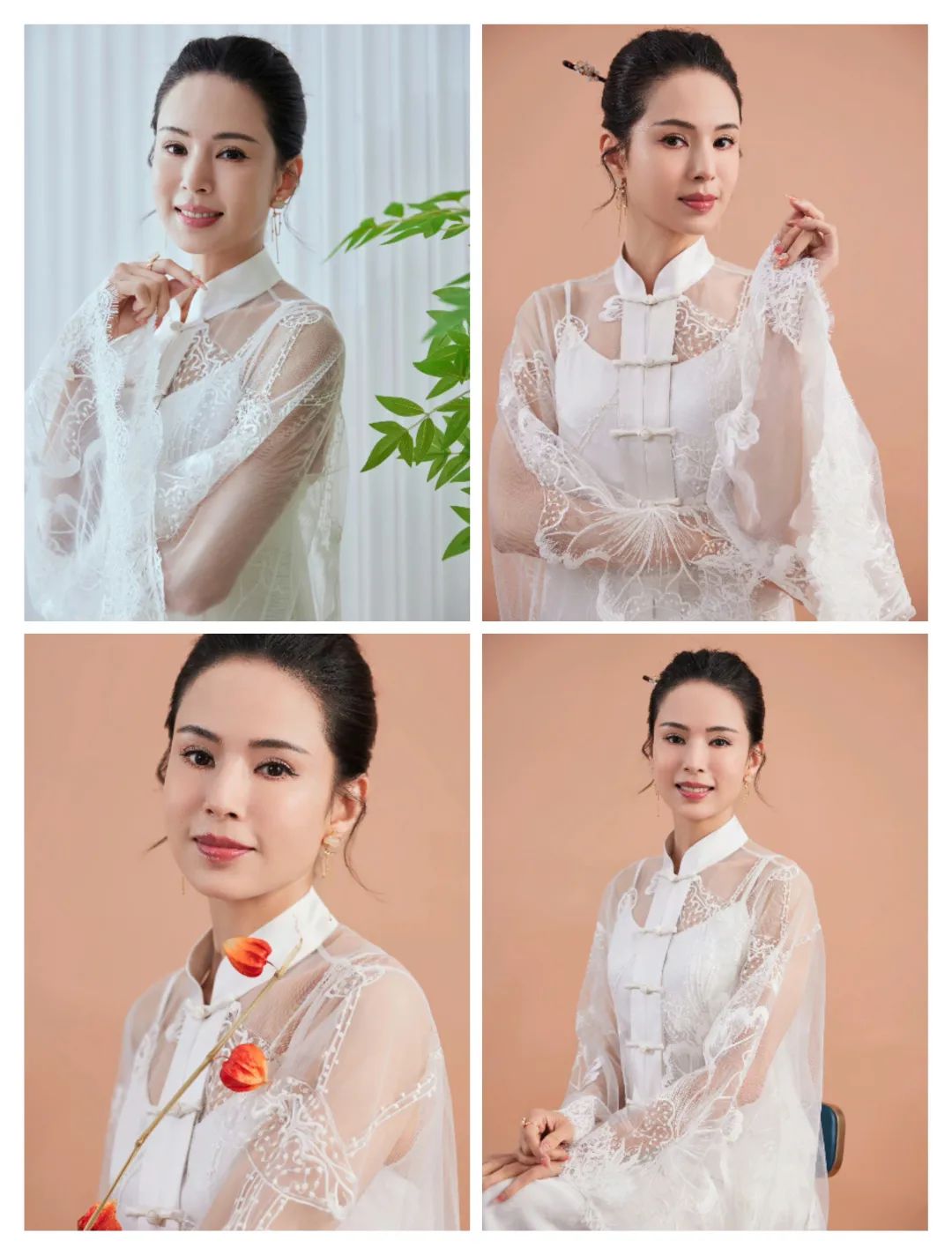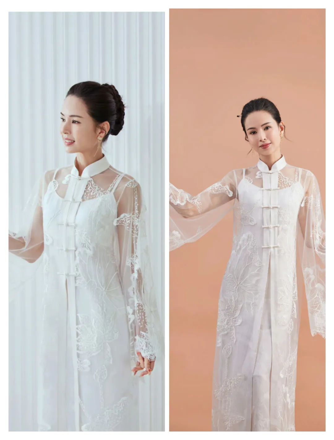 薄纱的外搭有立领造型、也有花纹图案的装饰,让白色服装的设计感更足。
