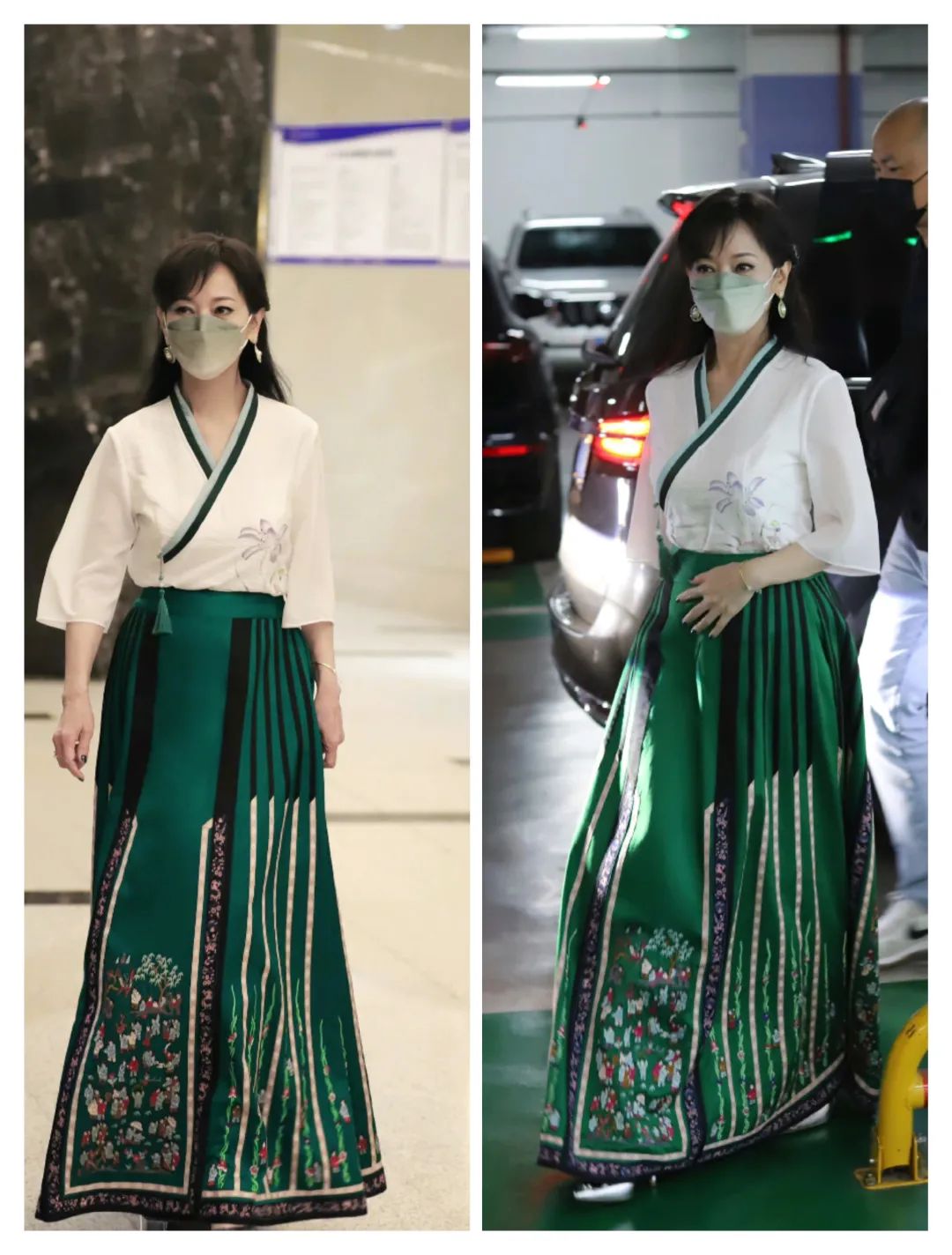 绿色的马面裙不仅有花纹图案的装饰,还有一些边缘让裙装多了一些条纹状的线条感。