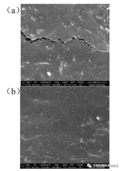 Wang等利用硫酸及硝酸对MWCNT引入羧基,随后利用乙二胺进行氨基官能化,并与聚乙烯胺(PV Am)混合制成纳米复合材料薄膜。经过电镜观察发现,未经官能团化的薄膜存在明显的缝隙,且均沿着MWCNT与PV Am的接触界面如图7a所示,官能团化后缝隙基本消失,呈现均匀的复合材料薄膜,如图7b所示。可见,填料/树脂的界面性能是影响复合材料的气密性的重要影响因素,官能团化对于提升气密性能也发挥着重要的作用。