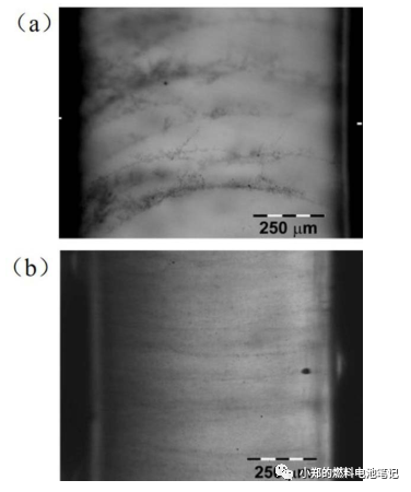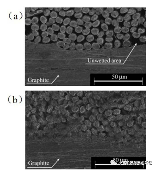 Kim等在CFF的一侧喷涂PF溶液,并与石墨箔贴合,通过辊压使CFF与膨胀石墨箔充分接触,热模压固化定型,制备成碳纤维/石墨箔分层式复合石墨极板,成型板材的厚度可以达到0.5 mm,截面的显微图像如图9所示。图9a显示PF的喷涂量较少的情况,碳纤维不能被完全润湿,造成CFF与石墨箔不能紧密结合。喷涂量达到15 g·m−2以上时,可以保证CFF与石墨箔紧密接触,如图9b所示。然而喷涂量不宜过大,否则在成型过程中PF会渗透到CFF与气体扩散层接触的接触面,会显著提高极板的ASR。在CFF表面清洁,无PF包覆的情况下,ASR可以保持在约20 mΩ·cm2。经过对板材气密性测试,复合石墨极板具有良好的气密性,文中提出这是由于石墨箔气体渗透率极低。Minkook等的研究结论也表明,2 μm厚的石墨箔即可显著提升复合石墨极板的气密性能,同时位于极板表面的石墨箔可以有效避免由于树脂富集。Yu等的试验结论也表明,石墨箔吸收表面富集的树脂后,复合石墨极板的贯穿面电阻大幅降低。相比于未添加石墨箔的复合极板,2和50 μm的石墨箔分别可以使ASR下降86%和90%。Du等将具有连续导电结构的膨胀石墨板在浸渍在EP溶液中,膨胀石墨板中的气体完全排出后,加热加压固化。当EP溶液浓度达到 40%时 ,气密性可达到 2 × 10–6 cm3·s−1·cm−2·Pa−1,抗弯强度达到50 MPa,同时ASR保持在20 mΩ·cm2。