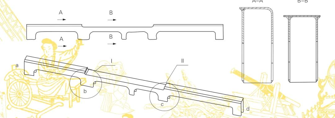 这里需要特别指出的是,由于牵引变流柜安装座的焊接变形比辅助变压器柜安装座的焊接变形要大得多,因此其矫正工艺有所不同。如图13 所示,牵引变流柜安装座左右两端与中间位置无论是结构还是焊缝的位置都是不同的。由于梁体的结构及焊缝在Ⅰ、Ⅱ位置出现了不连续性,导致梁体焊接后产生的变形在Ⅰ、Ⅱ位置表现得较为明显。A-A 截面与辅助变压器柜安装座的截面相同,B-B 截面的焊缝左右对称布置,所以梁体焊接后此位置在水平方向不会产生变形。如果按照辅助变压器柜安装座的位置进行弹性反变形,梁体中间位置由于受到外力作用,会在水平方向产生变形,所以两种梁体弹性反变形的位置是不同的。梁体变形主要发生在Ⅰ、Ⅱ位置,尤其是Ⅰ、Ⅱ位置会在梁体焊接后产生急弯,所以反变形时的施力点必须布置在变形最大处,即Ⅰ、Ⅱ位置处,才能取得较好的矫正效果。总之牵引变流柜安装座可以在自由状态下进行火焰矫正,而牵引变流柜安装座无论是矫正旁弯还是矫正下挠变形都必须在Ⅰ、Ⅱ位置施加外力,才能达到矫正的目的。