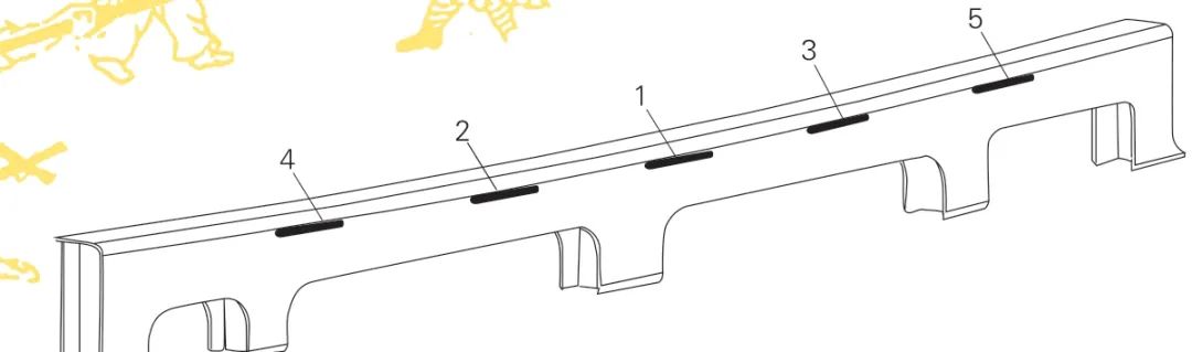 方案2:先矫正旁弯再矫正下挠。如果先矫正梁体的旁弯,就要在如图11所示的位置进行线状加热,加热后梁体向y-y 轴方向产生变形,于是梁体的旁弯得到矫正,此时梁体同样会向x-x 轴方向产生变形,即梁体也产生了下挠变形。在随后矫正下挠变形时,梁体的旁弯是否还会发生变化,这是此次矫正过程中的关键点。矫正梁体下挠变形时,由于采用了收缩力较强的三角形加热法,并且梁体两侧三角形加热必须同时、同步、同规范进行,或者按照如图12 所示的加热位置及加热顺序进行加热,在下挠变形得到矫正的同时,梁体的旁弯不会再次发生。此方法还可以避免由于梁体左、右两侧的收缩量不同导致梁体产生扭曲变形现象的发生,这样就可以节省一次加热的过程。所以先矫正旁弯,使梁体的直线度达到±1.0mm 的技术要求后,再矫正下挠是比较合理的。
