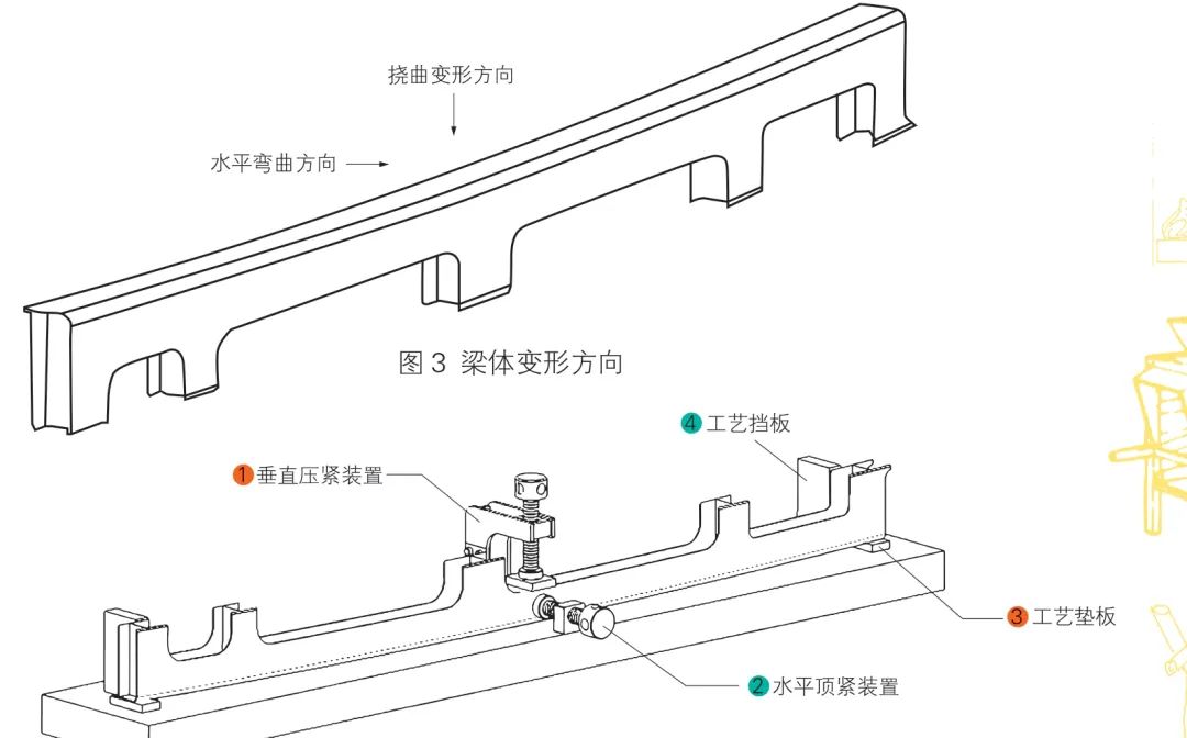 由于梁体焊接后在水平方向和垂直方向都产生了变形,因此梁体的矫正顺序也很关键。先矫正旁弯还是先矫正下挠,必须通过全面的分析和对比选择一种矫正效率高、矫正效果明显的方案进行。