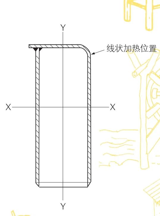 矫正梁体旁弯时,应在弯板的立面(凸面)进行线状加热。如图8 所示,若火焰沿小筋板的焊缝向上线状加热至弯板的R 处,冷却后由于加热线的横向收缩,使梁体凸面一侧的长度“变短”,于是梁体被“拉直”。此加热方法虽然不能使梁体的直线度达到技术要求,但减少了后续矫正旁弯时在x-x 轴上方的加热面积,减小了梁体的下挠变形。