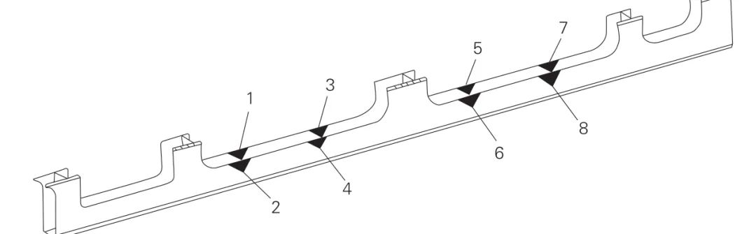 焊接小筋板时,不同的焊接方向会引起不同的变形情况和内应力状态,所以尽可能使焊缝收缩引起的变形与梁体焊后变形方向相反。以弯板与小筋板a2 焊缝为例进行说明,如图6 所示,焊接a2 焊缝时都采用同一方向“直通”焊接,即由梁体底部向R 圆弧方向进行焊接。由于每道焊缝都是始焊端的横向收缩略大于终焊端,导致a2 焊缝的横向收缩引起梁体产生了上拱变形,恰好与梁体焊后产生的下挠变形方向相反,减小了梁体的变形程度。