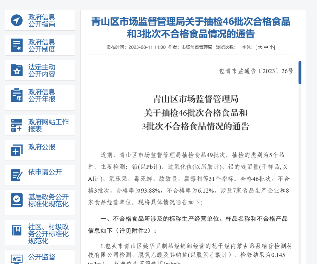 近期,青山区市场监督管理局抽检食品49批次。抽检的类别为5个品种。主要检测:铅(以Pb计)、过氧化值(以脂肪计)、铝的残留量(干样品,以Al计)、氧乐果、毒死蜱、敌敌畏、腐霉利等31个指标。合格46批次,不合格3批次,合格率为93.88%,不合格率为6.12%,涉及7家食品生产企业和8家食品经营单位。现将具体情况通告如下: