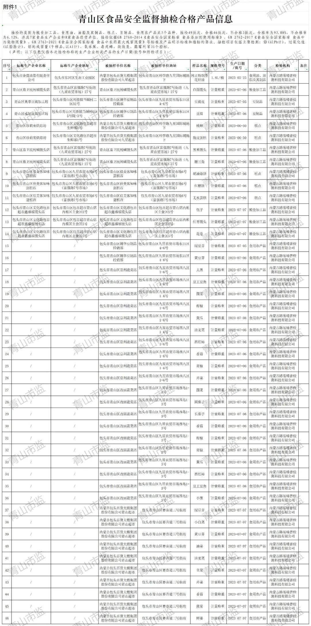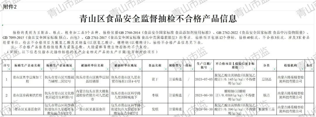 二、对上述抽检中发现的不合格产品及不合格产品的生产经营者,青山区市场监督管理局正在按照《中华人民共和国食品安全法》等相关法律法规的规定,开展核查及调查处理工作,并责令食品经营单位采取下架措施。相关情况另行公布。