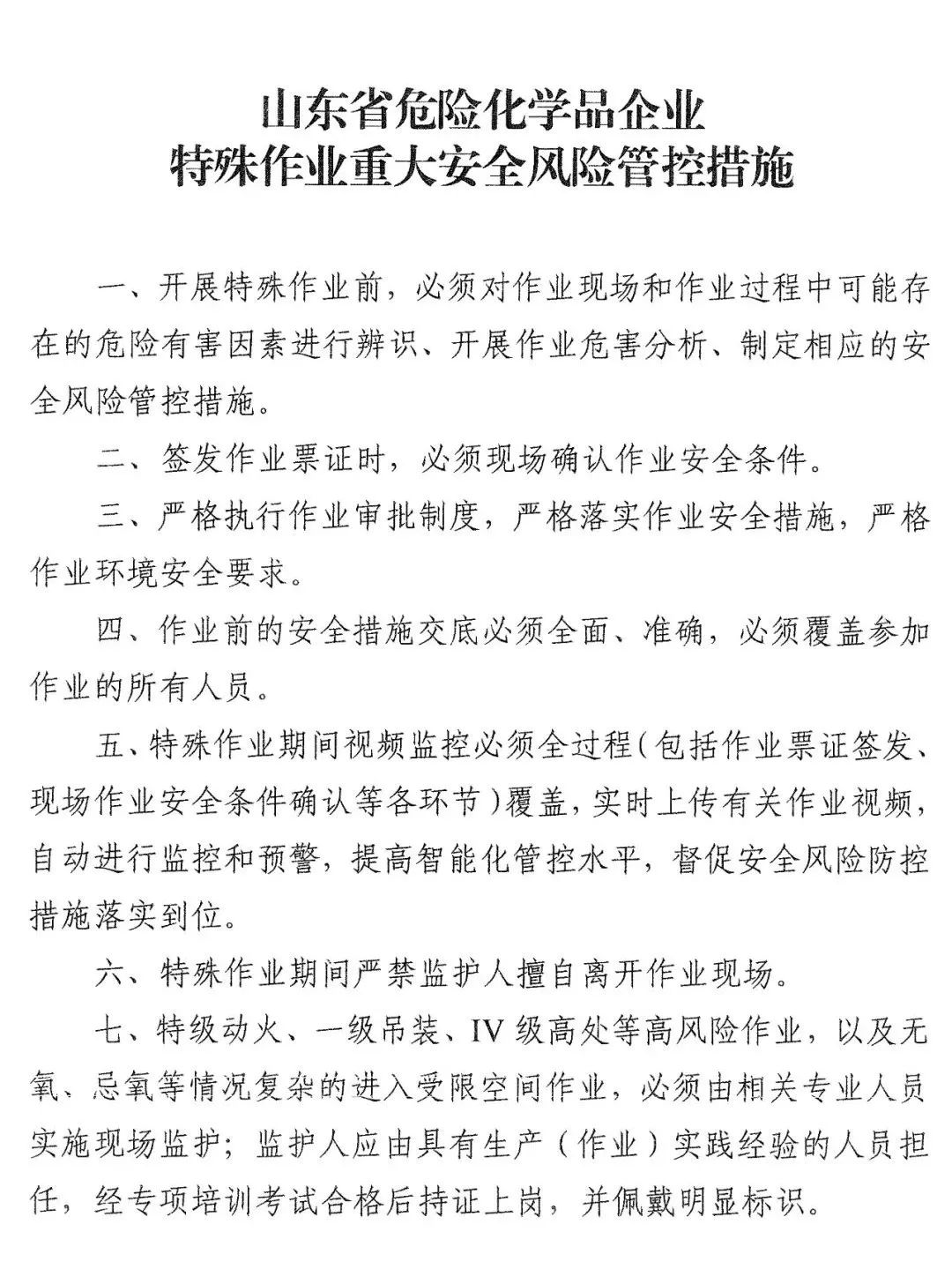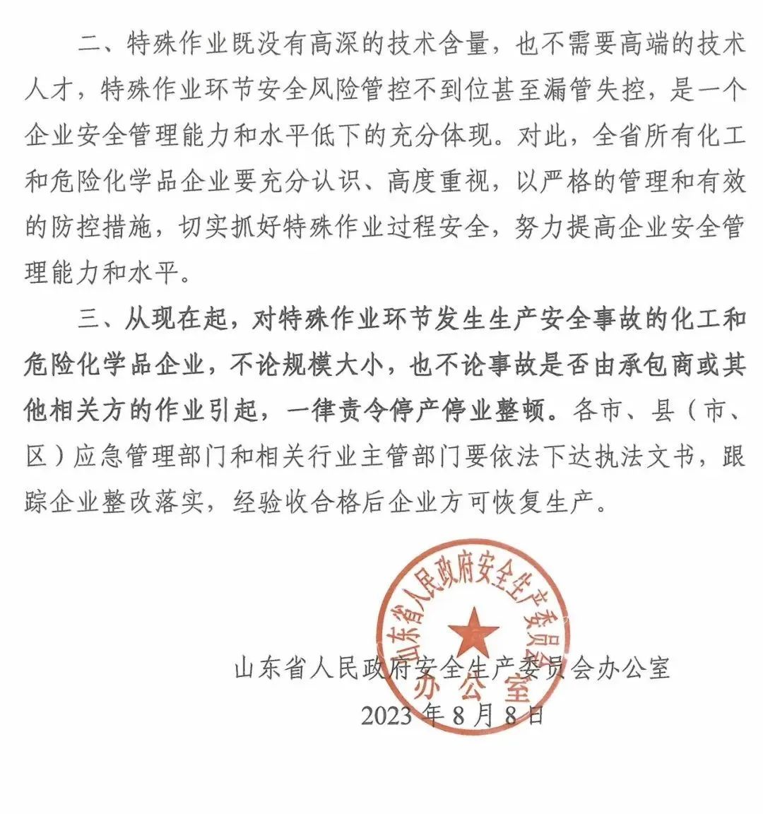 山东省安委会发布关于印发《山东省危险化学品企业特殊作业重大安全风险管控措施》的通知,指出从现在起,对特殊作业环节发生生产安全事故的化工和危险化学品企业,不论规模大小,也不论事故是否由承包商或其他相关方的作业引起,一律责令停产停业整顿。