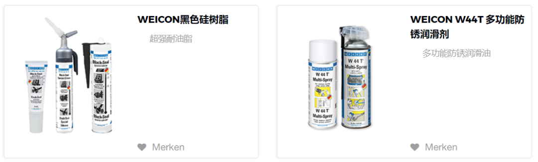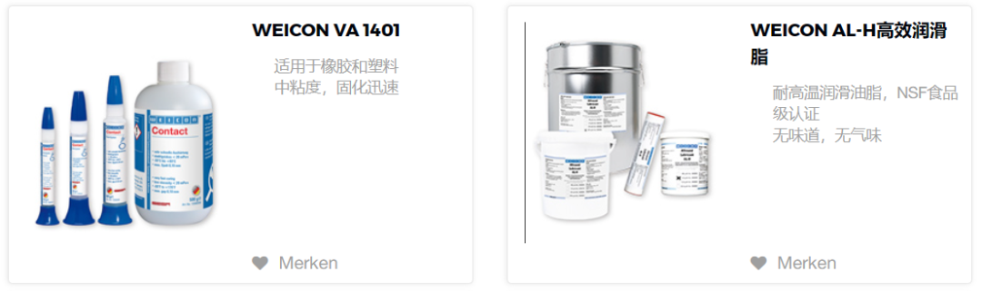 该公司产品类型丰富,其主要包括:环氧树脂系列,聚氨醋系列,结构胶/RK系列/GMK系列,厌氧型密封胶-WEICONLOCK,瞬间胶-气基丙烯酸盐粘合剂,弹性密封胶系列,工艺喷剂系列,防卡剂/润滑脂,线缆工具 WEICON TOOLS等。