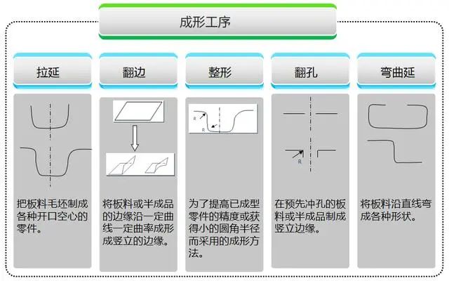 成形工序:弯曲、卷圆、扭曲、拉深、变薄拉深、翻边(孔的翻边、外缘翻边)、缩口、扩口、起伏、卷边、涨形、旋压、整形、校平、压印、挤压(正挤压、反挤压、复合挤压)。