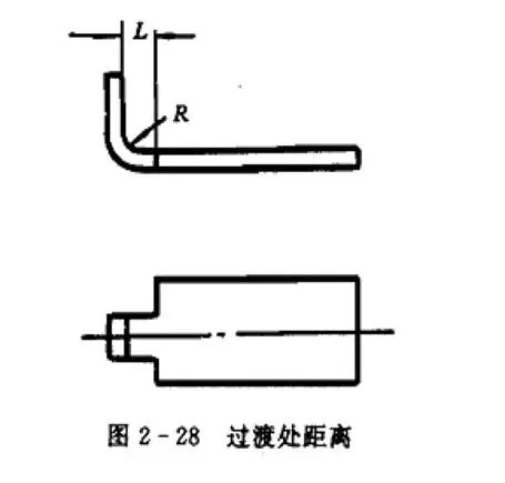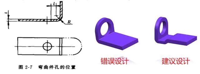 如下图对于弯曲件,从孔边到弯曲半径R中心的距离取为:当t<2mm的时,l≥t;当t≥2mm的时,l≥2t。