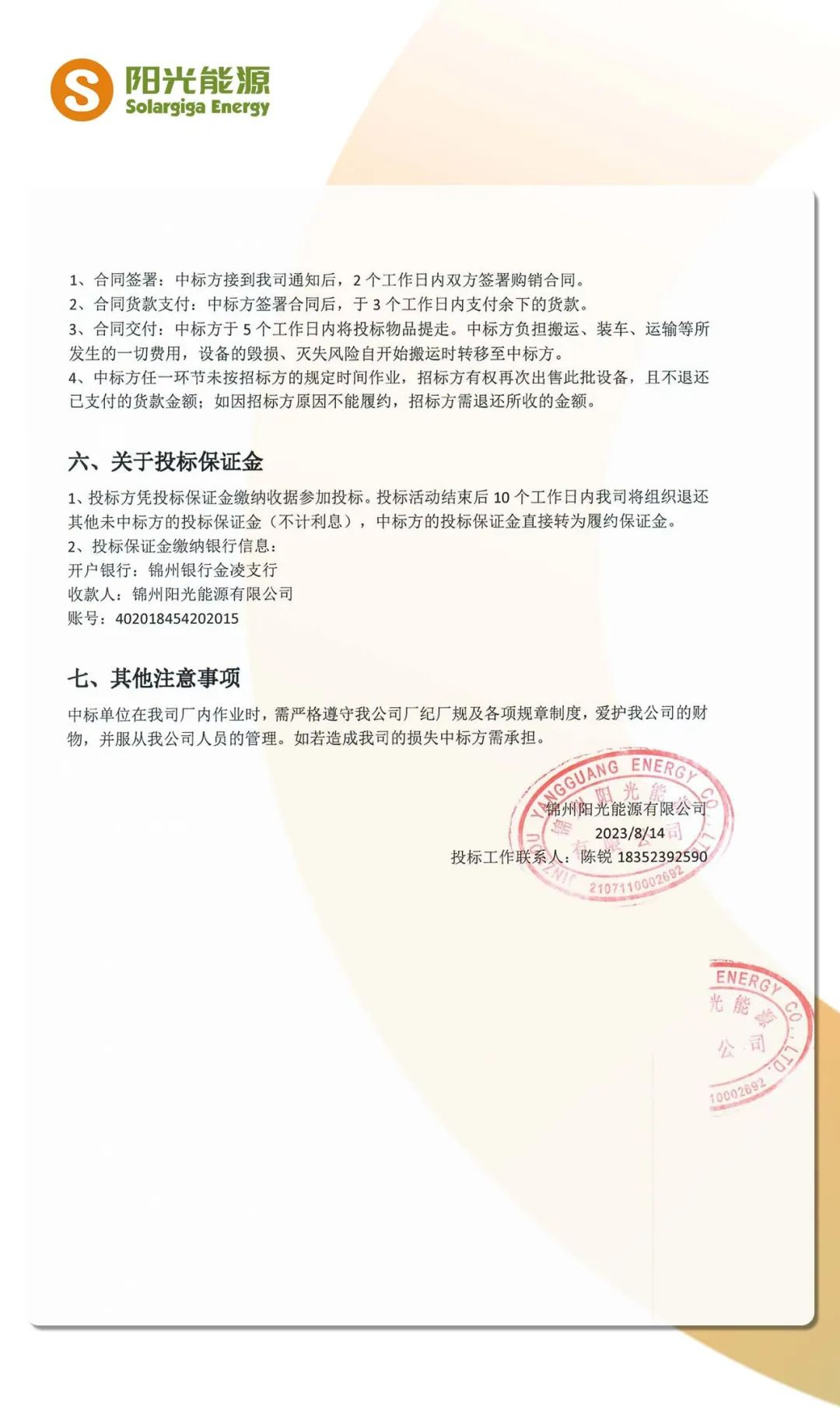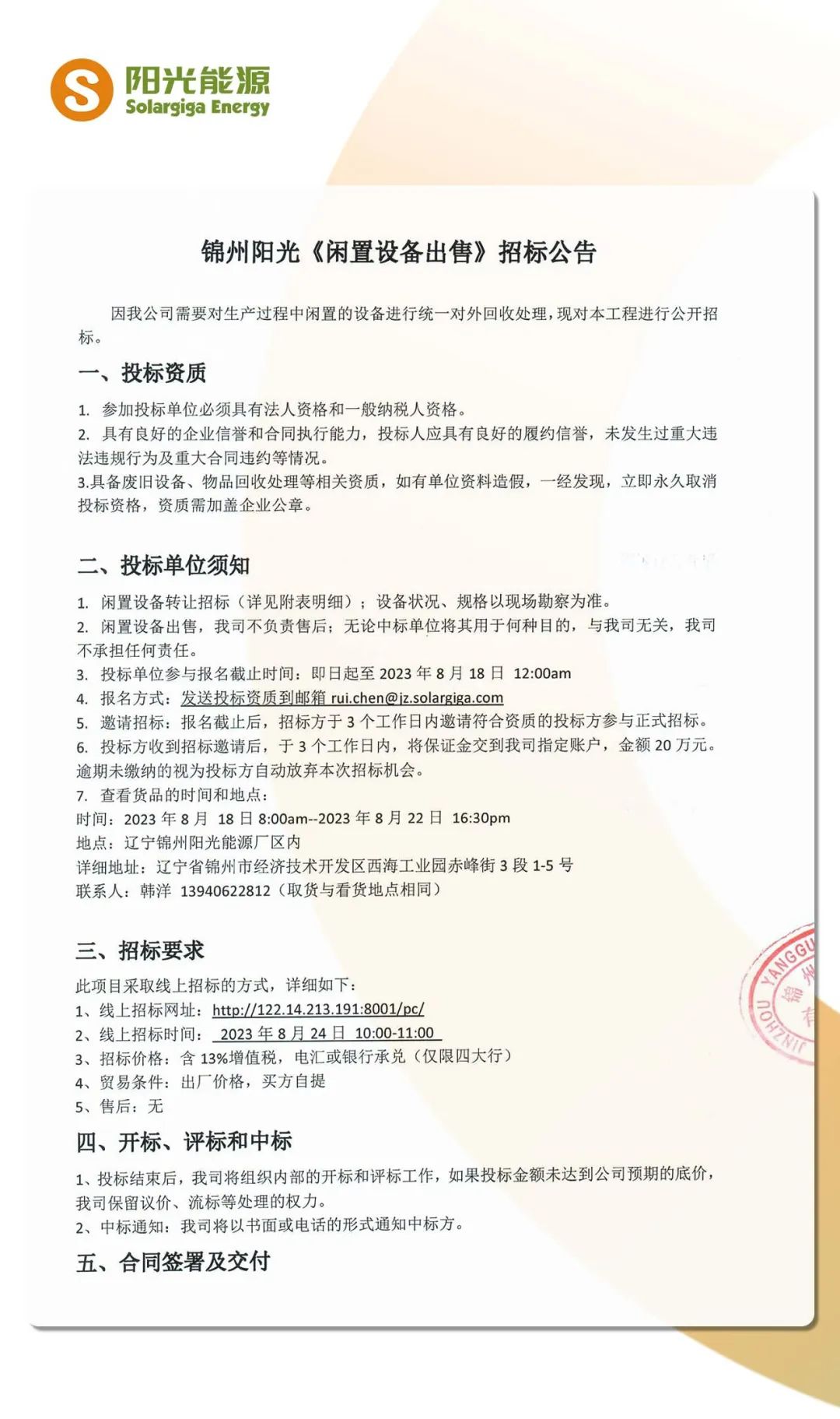 招标公告 | 阳光能源设备等固定资产对外销售招标