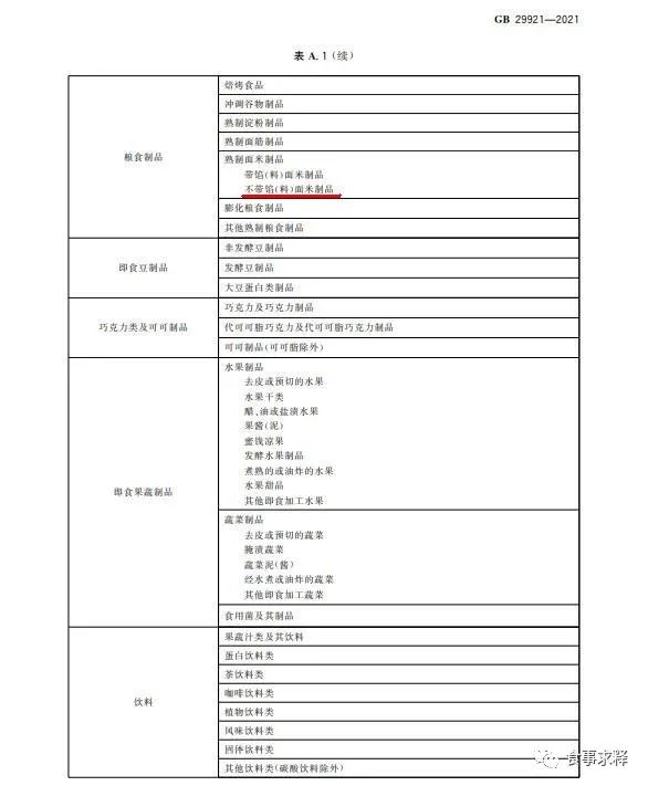 GB 29921-2021标准附录A食品类别(名称)说明将预包装食品分为13大类,食品类别(名称)说明(附录A)用于界定致病菌限量适用的食品类别,只适用于本标准。本标准适用于表1类别中的预包装食品,不适用于执行商业无菌要求的食品、包装饮用水、饮用天然矿泉水。