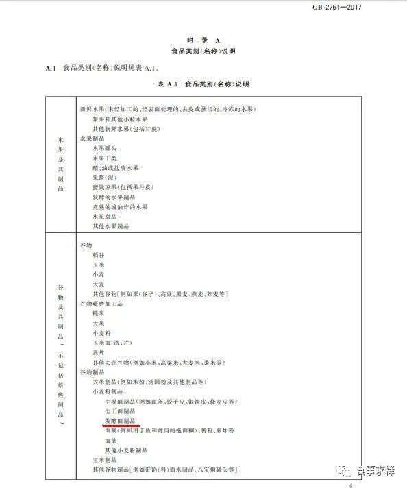 GB 2761-2017标准附录A食品类别(名称)说明涉及10大类食品,每大类下分为若干亚类,依次分为次亚类、小类等,食品类别(名称)说明(附录A)用于界定真菌毒素限量的适用范围,仅适用于该标准。当某种真菌毒素限量应用于某一食品类别(名称)时,则该食品类别(名称)内的所有类别食品均适用,有特别规定的除外。