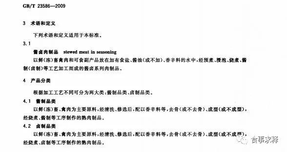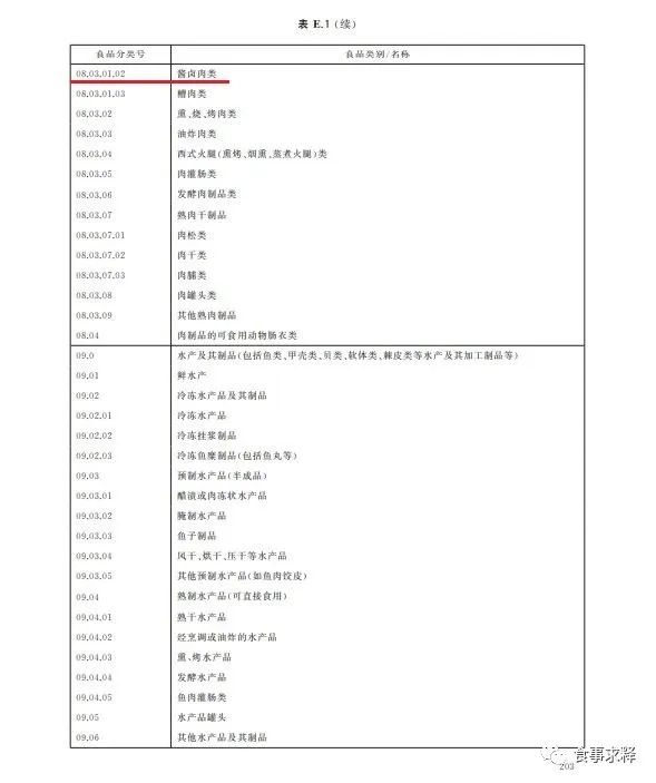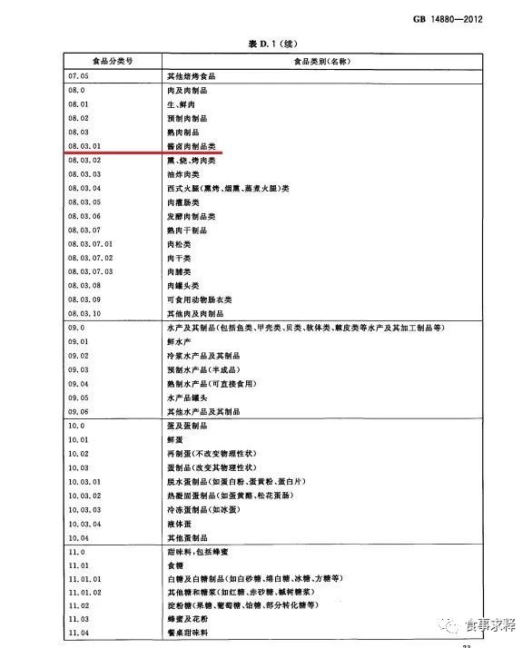 馒头在GB 14880-2012标准食品类别(名称)说明中食品分类号为06.03.02,食品类别/名称为小麦粉制品。酱卤肉制品在GB 14880-2012标准食品类别(名称)说明中食品分类号为08.03.01,食品类别/名称为酱卤肉制品类。