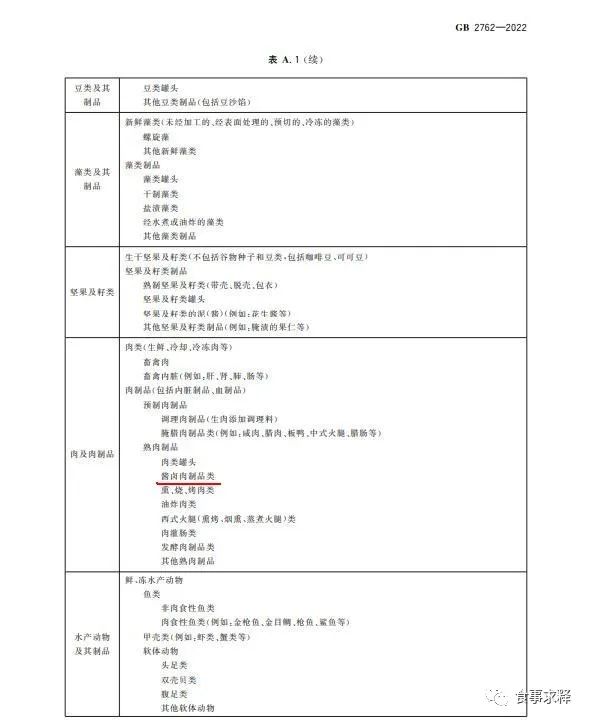 馒头在GB 2762-2022标准中食品类别(名称):谷物及其制品(不包括焙烤食品)→ 小麦粉制品 → 发酵面制品。酱卤肉制品在GB 2762-2022标准中食品类别(名称):肉及肉制品 → 熟肉制品 → 酱卤肉制品类。