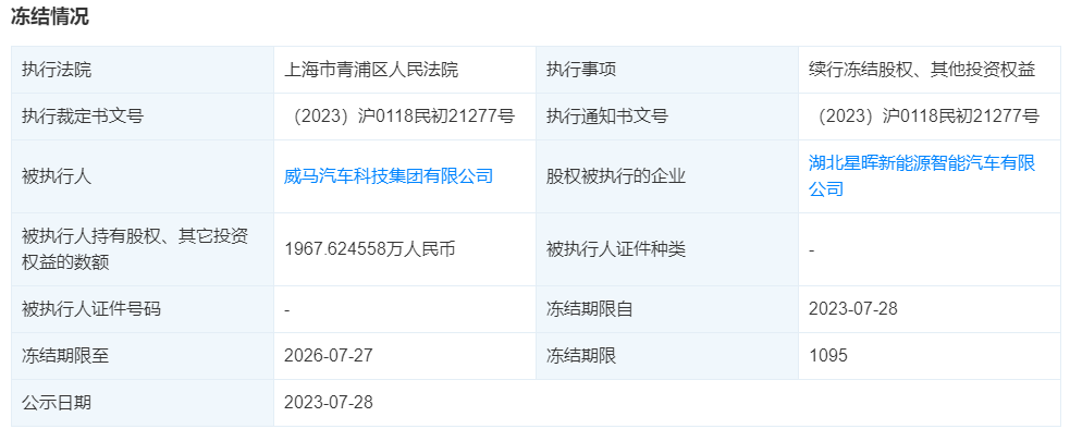 此外,7月28日公示显示,威马汽车被冻结股权数额1967.62元,股权被执行的企业为湖北星晖新能源智能汽车有限公司,执行法院为上海市青浦区人民法院,冻结期限自2023年7月28日至2026年7月28日。