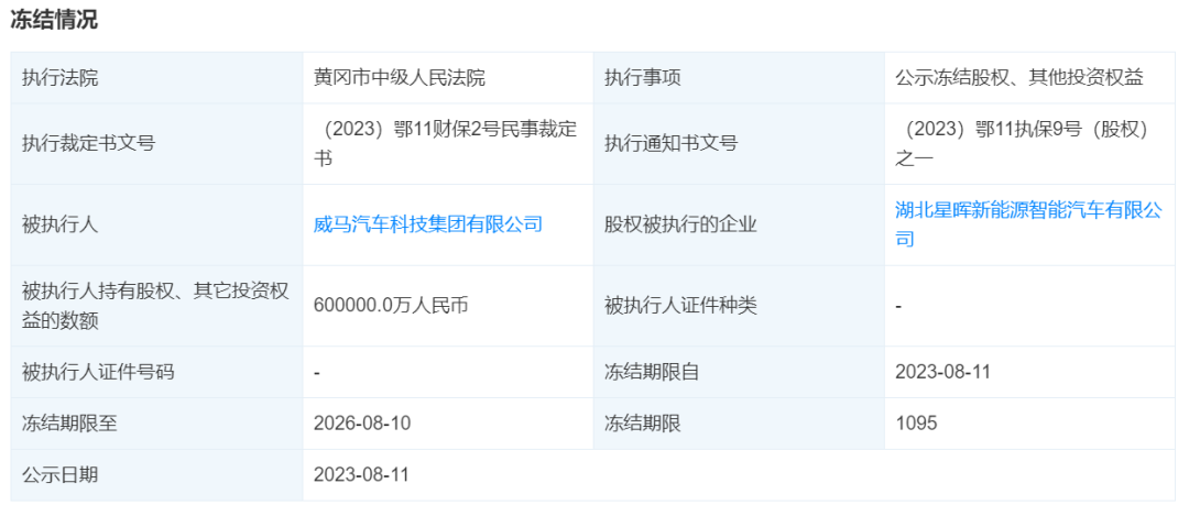 天眼查消息显示,8月11日,威马汽车科技集团有限公司(简称:威马汽车)新增一则股权冻结信息,被冻结股权数额60亿人民币,股权被执行的企业为湖北星晖新能源智能汽车有限公司,执行法院为黄冈市中级人民法院,冻结期限自2023年8月11日至2026年8月10日。
