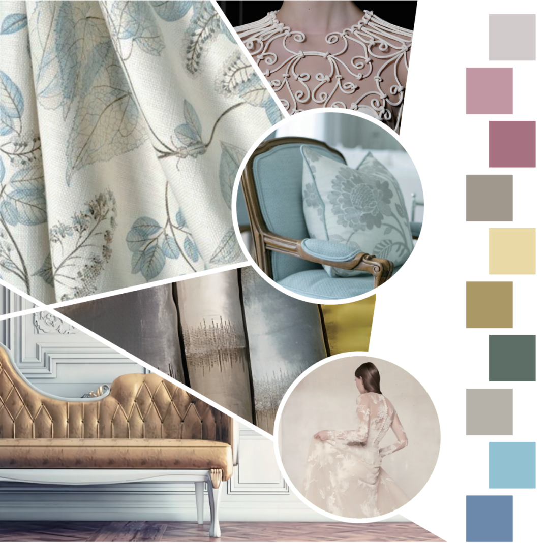这一主题出丰富且细腻的设计。优雅被古典和浪漫的主题唤起,代表了古典主义理想化的当代诠释。在这里,我们强调柔和的曲线、盛开的枝干和花卉组合,以及以石膏设计为灵感的精美图案。