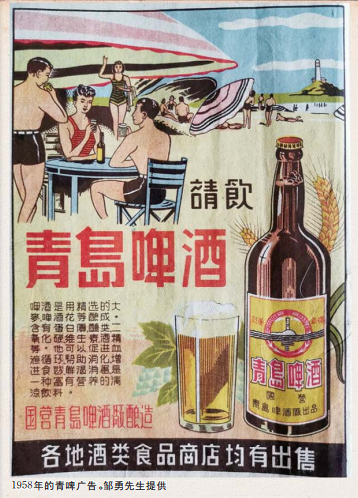 “青岛啤酒一杯在手,真是其味无穷”,1957年青岛啤酒通过黑白影像向全球展示了第一支广告;1958年,青啤的彩色广告也曾刊载在同时期的报纸上。虽然彼时媒介表达效果有限,但透过广告画,青岛啤酒泡沫满溢的特点也生动清晰。