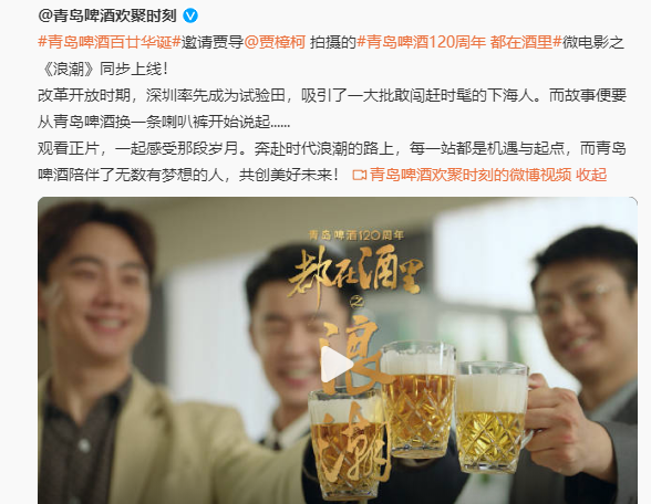 今年7月,其邀请知名导演贾樟柯拍摄#青岛啤酒120周年 都在酒里#系列微电影,以电影质感表达品牌底蕴,将岁月更迭与品牌发展融合在一起。