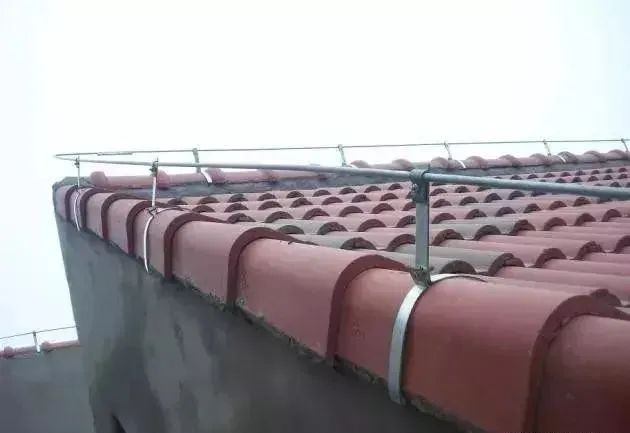 斜屋面避雷带安装,屋脊瓦处采用扁钢固定卡,避免钻孔击碎屋面瓦。