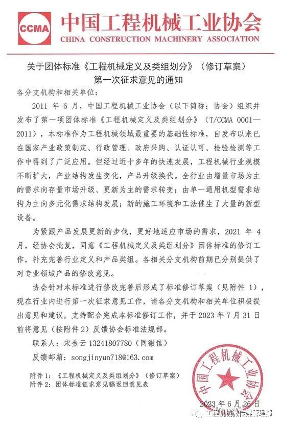 2011年6月,中国工程机械工业协会(以下简称:协会)组织并发布了第一项团体标准《工程机械定义及类组划分》(T/CCMA 0001—2011),本标准作为工程机械领域最重要的基础性标准,自发布以来已在国家产业政策制定、行政管理、政府采购、认证认可、检验检测等工作中得到了广泛应用。但经过近十多年的快速发展,工程机械行业规模不断扩大,产业结构发生变化,产品升级换代。全行业由增量市场为主的需求向存量市场升级、更新为主的需求转变;由单一通用机型需求结构为主向多元化需求结构发展;新的施工环境和工法催生了大量的新型设备。为紧跟产品发展更新的步伐,更好地适应市场的需求,2021年4月,经协会批复,同意《工程机械定义及类组划分》团体标准的修订工作,补充完善行业定义和产品类组。各相关分支机构前期已分别提供了对专业领域产品的修改意见。协会针对本标准进行修改完善后形成了标准修订草案(见附件1),现在行业内进行第一次征求意见工作,请各分支机构和相关单位积极提出意见和建议,支持配合完成本标准修订工作,并于2023年7月31日前将意见(按附件2)反馈协会标准法规部。反馈邮箱:songjinyun718@163.com附件2:团体标准征求意见稿返回意见表