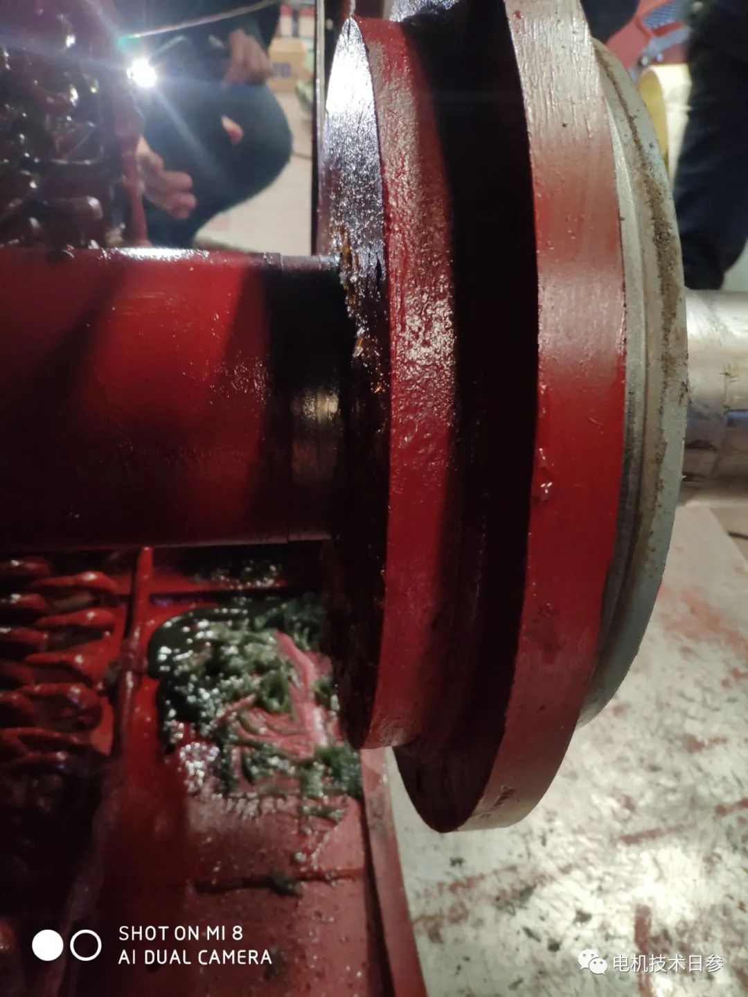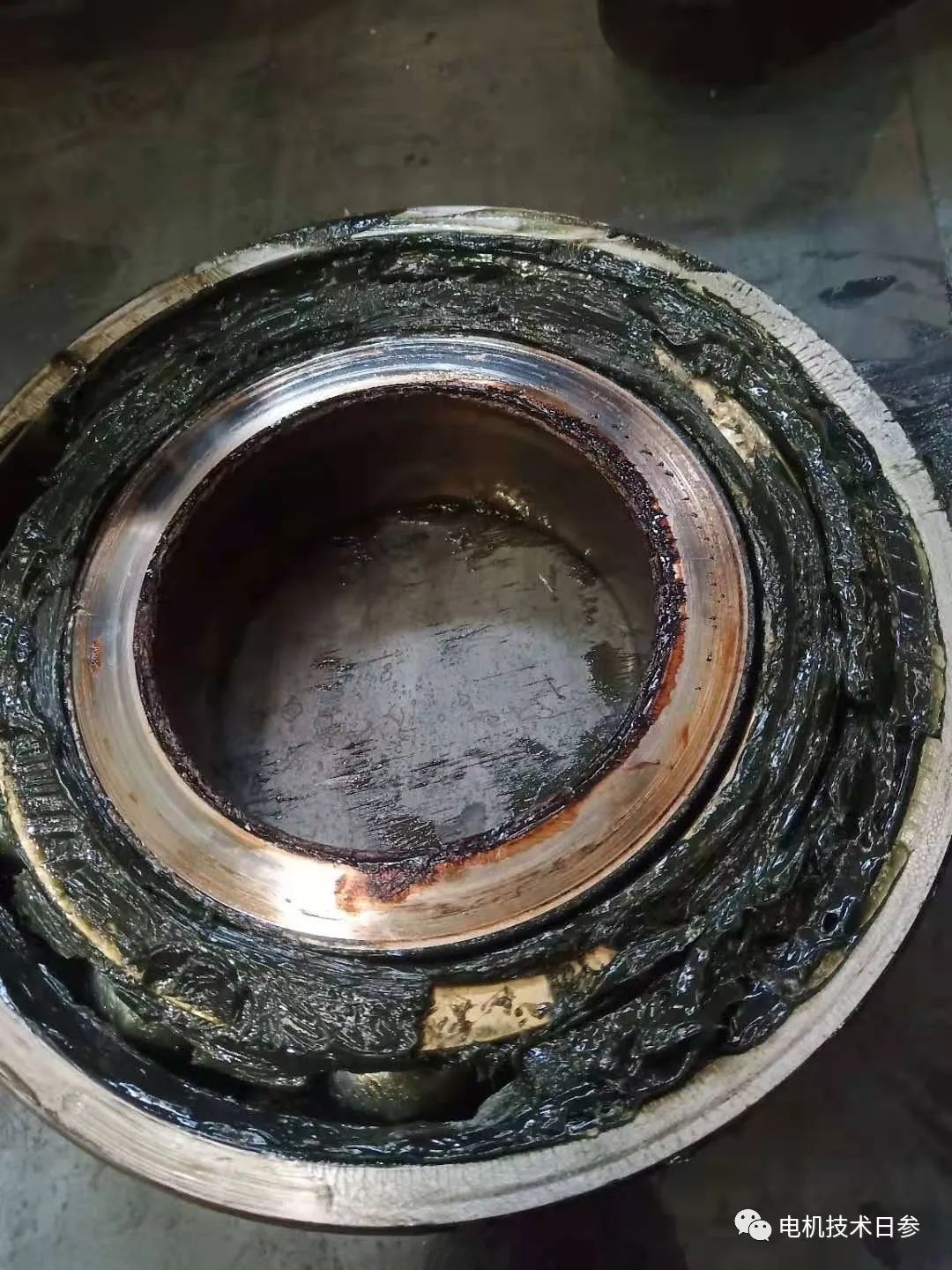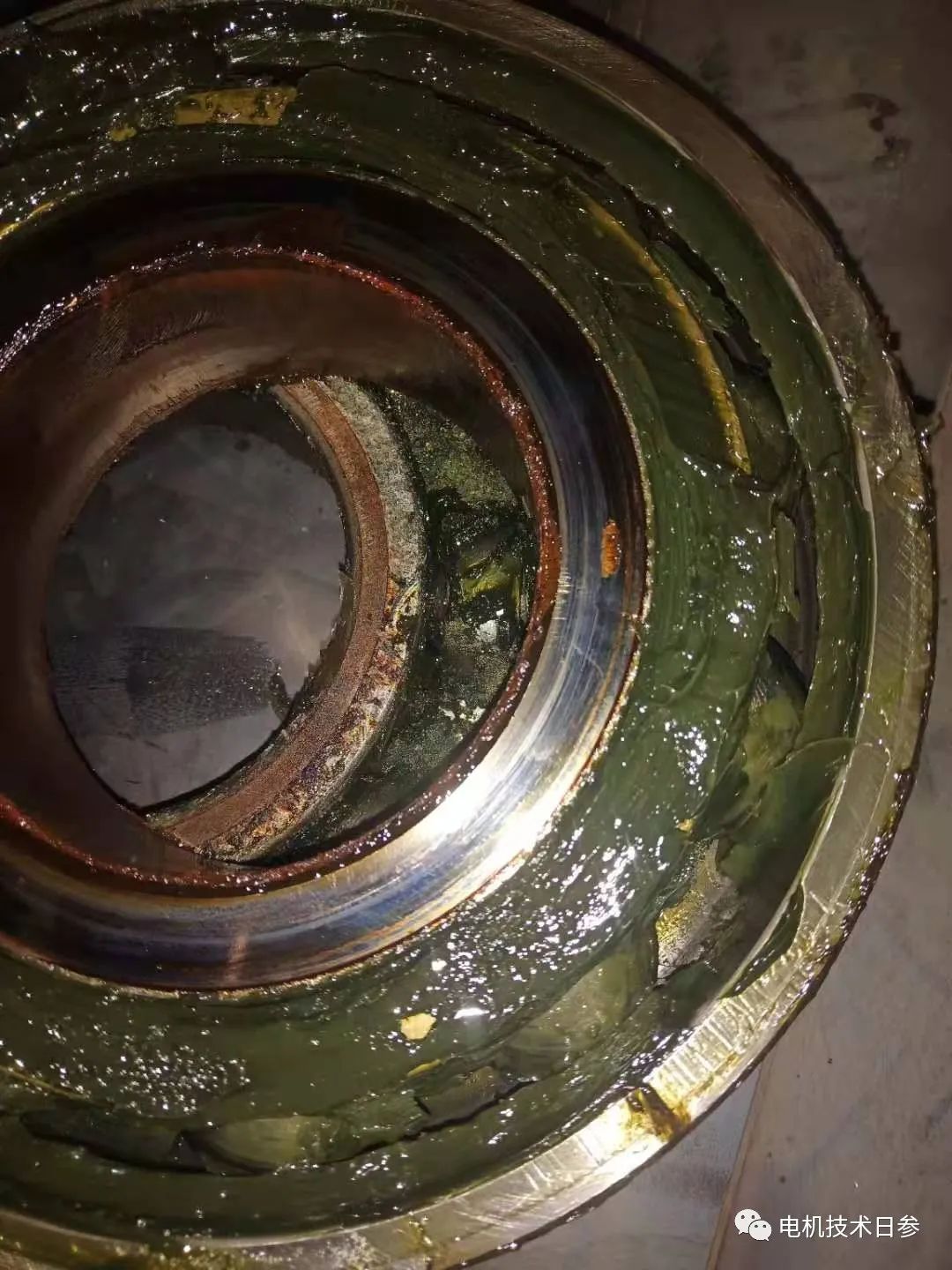 经了解,该电机为进口产品,期间可能已经过修理,电机轴伸端采用圆柱滚子轴承,轴承系统内也有挡油盘;电机发生杂音后拆解,可以发现大多数的油脂已被从轴承内腔甩出,轴承盖内积满了被甩出的油脂。
