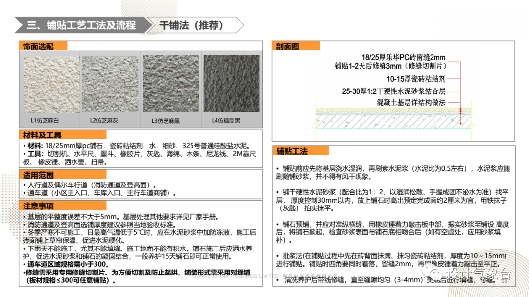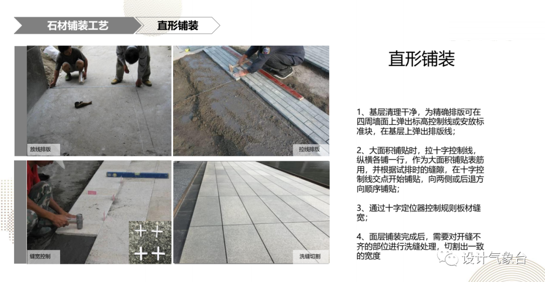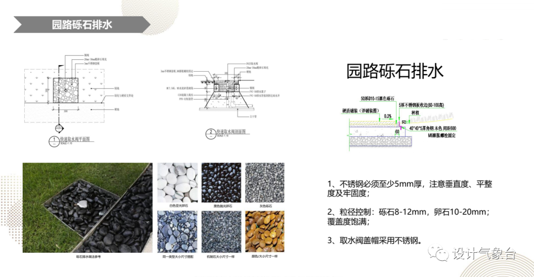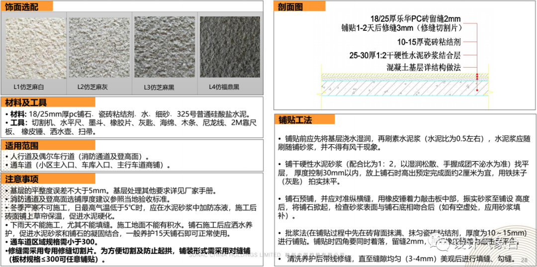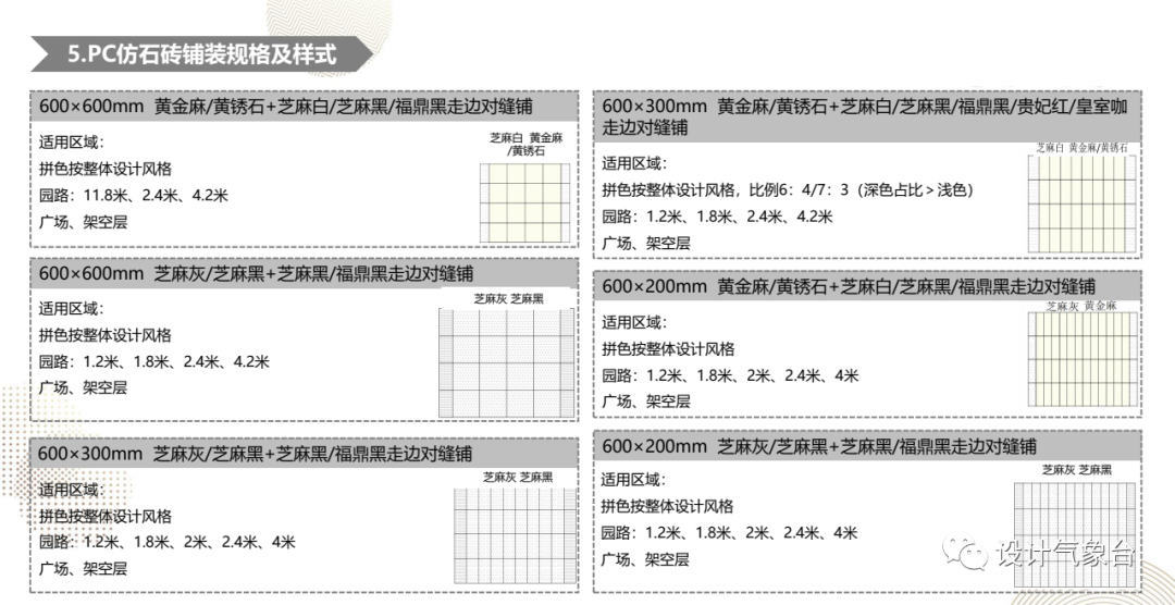 比方说你最常见的道路铺装,它里面就有多种不同材质的铺装工艺手法、各材料的优劣势、常见铺法、以及常用的规格及样式。