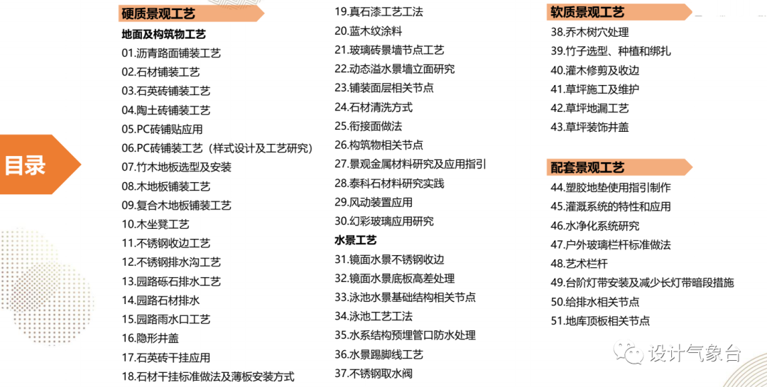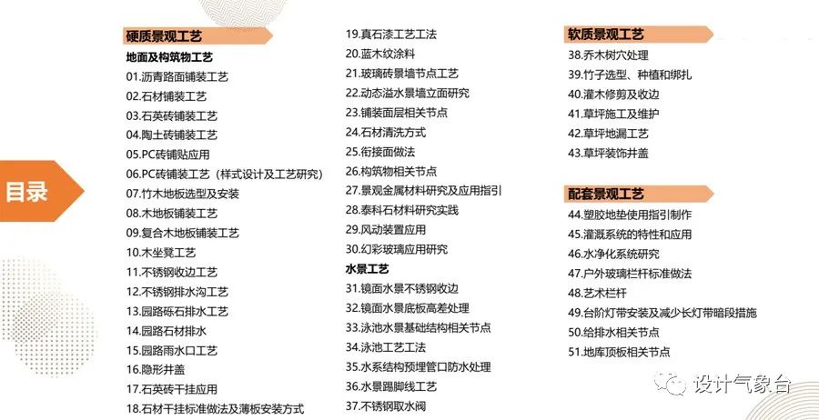 这本做法集分为地面、构筑物、水景、软景、配套5大类,并以此为基础细化出51个小类别,让你清晰、系统地了解各项工艺细节。