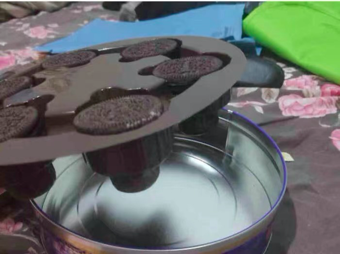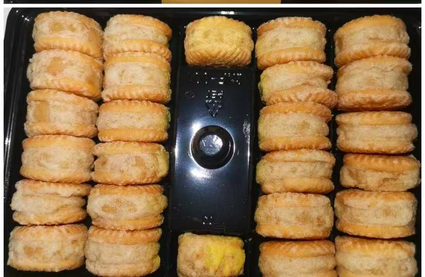 只见三等份的包装盒的中间莫名其妙凹进去了一部分,这位博主也是被逗笑了,直呼商家缺的不是饼干是德。