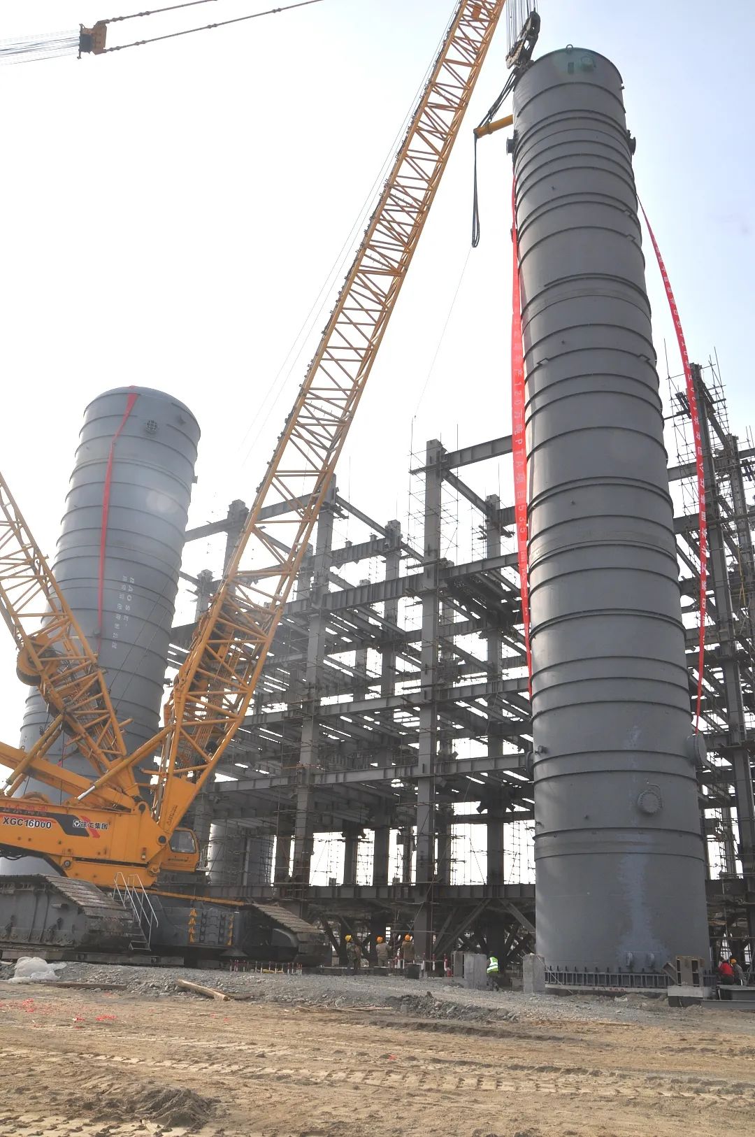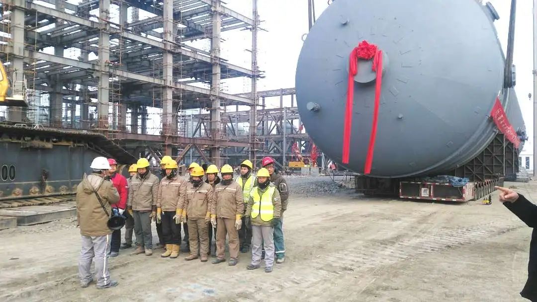 唯有奋斗,不负韶华。大型设备吊装是项目施工的难点和重点,中泰石化PTA装置共有100吨以上大型设备25台,其中22台大型设备吊装都在严寒的冬季进行。每次大型设备吊装,项目部领导都高度重视,吊装前反复与技术人员研究吊装方案,每道工序都进行周密的部署,确保设备吊装万无一失。2019年1月19日,数九天的新疆库尔勒,寒风刺骨,项目部参战将士却斗志昂扬、不畏严寒,目前全球PTA行业最大的鼓泡式氧化反应器将由他们吊装就位,上午11:00整,随着1250吨主吊车匀速卷扬,750吨辅机平稳递送,反应器平稳向上提升,12:55分,直径9.21米,高42.56米,重611吨, PTA行业单体最重、容积最大的鼓泡式PTA氧化反应器顺利吊装成功,稳稳坐落到基础上,为后续钢结构及设备安装奠定了坚实的基础,为装置施工稳步推进竖起了“灯塔”。