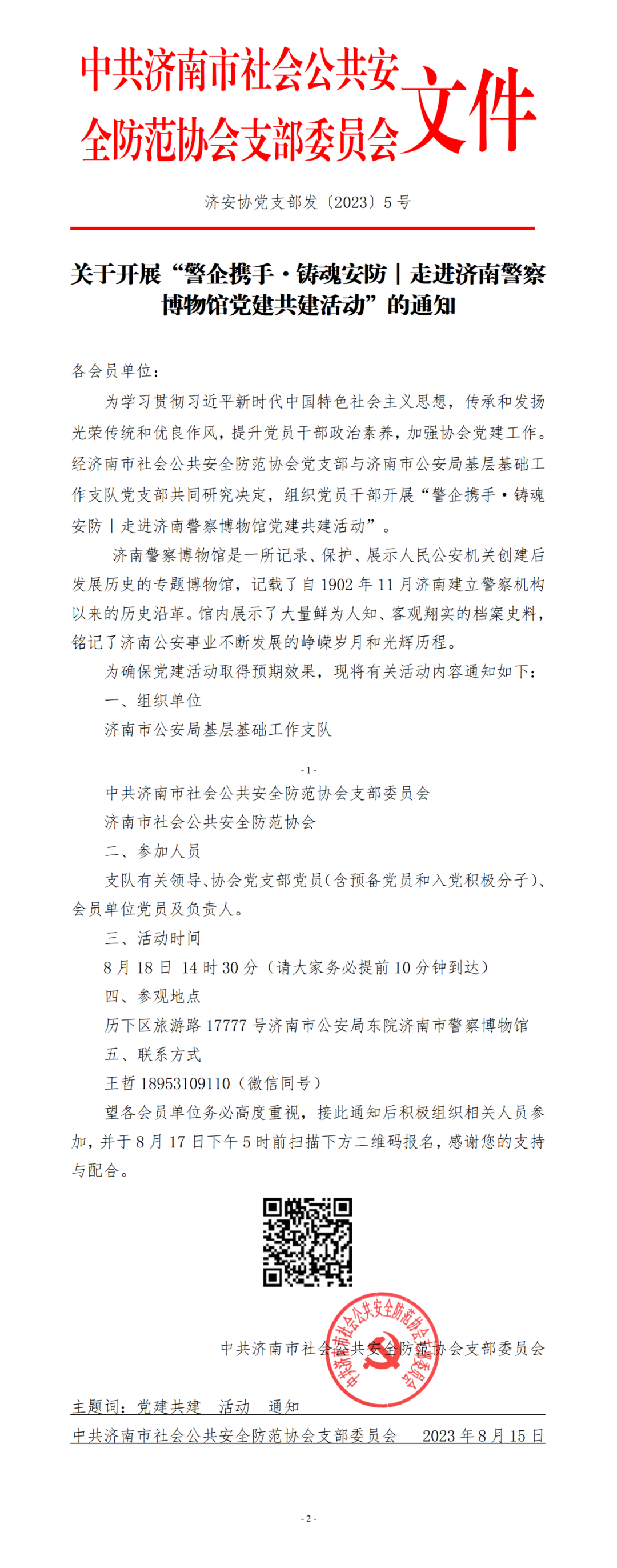 为学习贯彻习近平新时代中国特色社会主义思想,传承和发扬光荣传统和优良作风,提升党员干部政治素养,加强协会党建工作。经济南市社会公共安全防范协会党支部与济南市公安局基层基础工作支队党支部共同研究决定,组织党员干部开展“警企携手·铸魂安防|走进济南警察博物馆党建共建活动”。