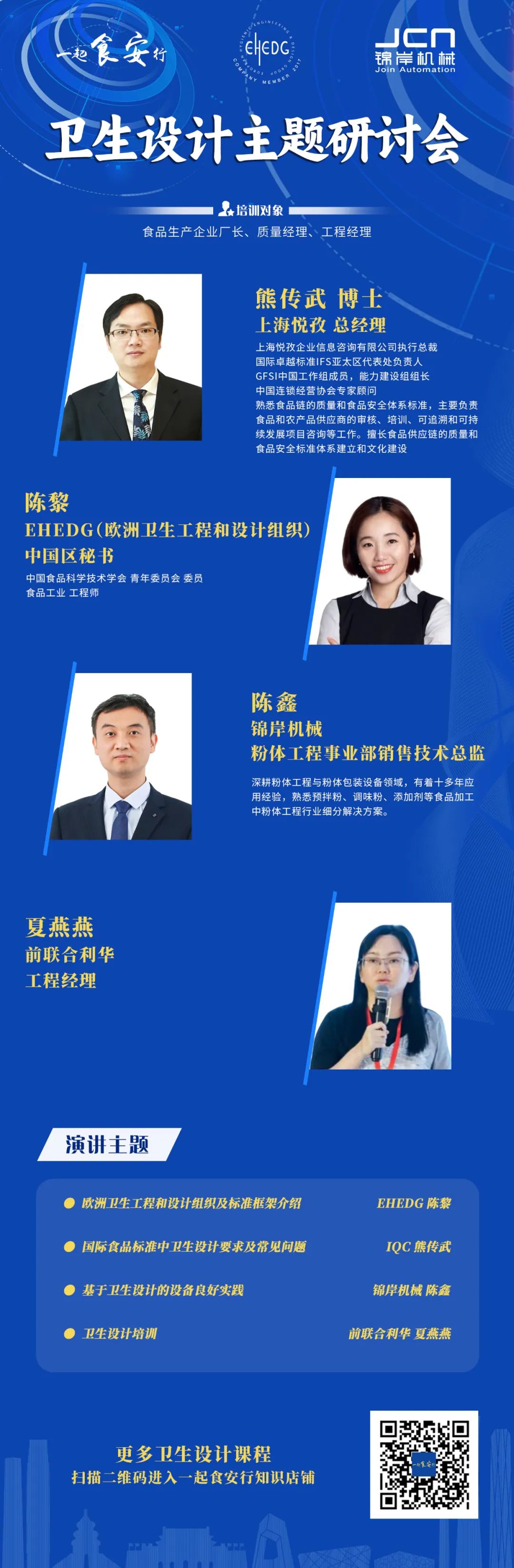 本次研讨会特邀食品工厂卫生设计专家及食品行业专家围绕食品工厂常见卫生问题、国际主流标准对卫生设计要求、卫生设计重点要求及良好实践等主题进行专业分享,并组织参观锦岸工厂,欢迎大家共同研讨!