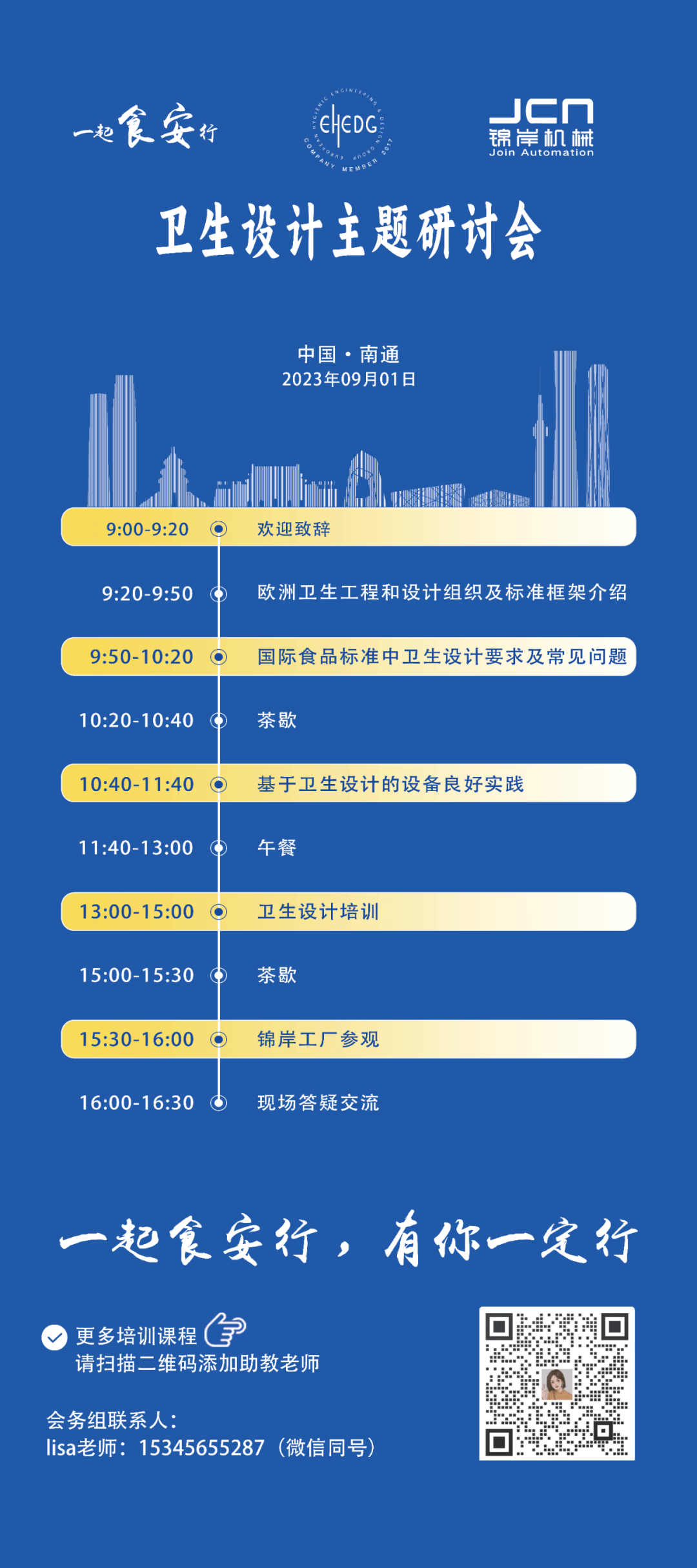 由一起食安行主办,EHEDG提供支持,锦岸机械科技有限公司承办的“食品工厂卫生设计线下主题研讨会”将于2023年9月1日9:00-17:00在南通举办。