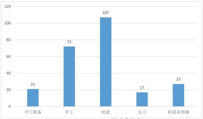 从项目进展阶段看,可明确进展阶段的项目中,拟建项目(含开工准备和开工项目)共93个,在建项目124个。详见下图。