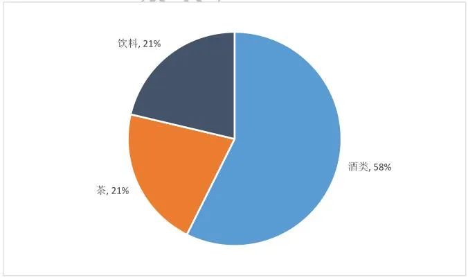 从项目类型看,酒类项目共140个,占比最高为58%;茶和饮料类项目数量相当分别为51、53个,占比均为21%。详见下图。