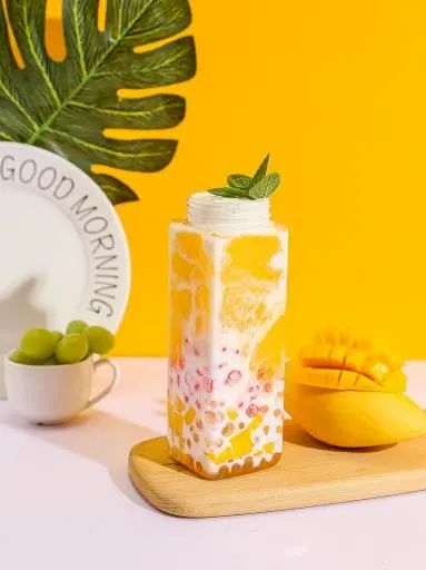 取杯加入原味脆波波,再加入芒果切丁、桃味脆波波或者新鲜红西柚果肉粒(倒入椰浆20ml)底部备用,取冰沙机加入芒果60g-80g、冰块260g、芒果果浆30ml、果糖20ml、茶汤250ml进行搅拌,搅拌后倒入杯中 淋上奶盖后出品即可。