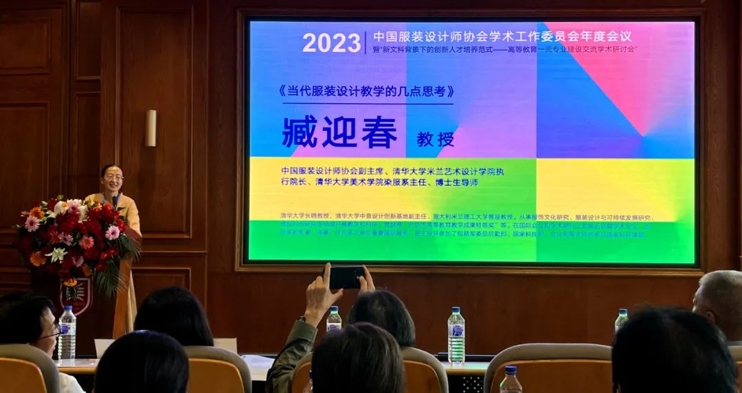 清华大学米兰艺术设计学院执行院长、清华大学美术学院染服系主任、博士生导师臧迎春教授从国际院校与清华美院的服装设计教学角度出发,提出要持续思考全球性问题,关注人类与本土文化,关注人工智能与产业发展,要加强学科交叉与融合,整合全球专业学术资源,在传承与变革中发现未来,以良知和专业智慧构建现实。