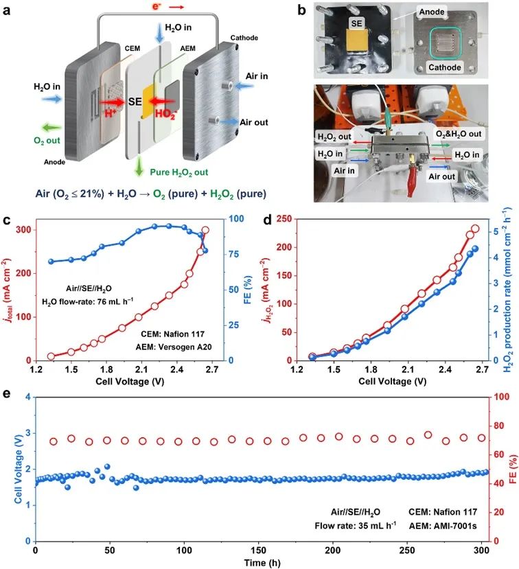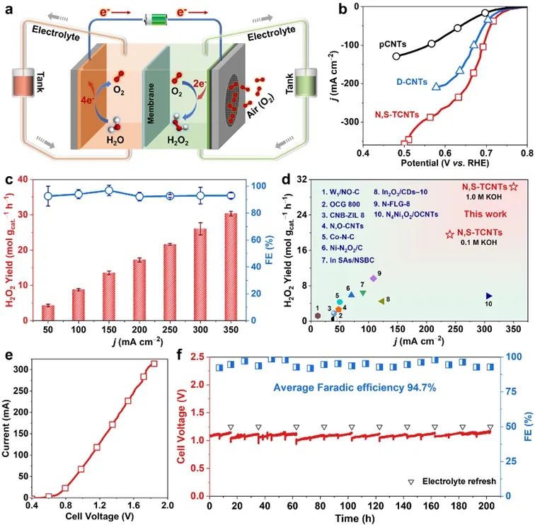 电化学测试表明,N,S-TCNTs具备优于大多数报道C-MFECs的起始电位和H2O2选择性以及更宽的H2O2合成电位区间。此外,发现适度增加的杂原子密度(THD)可大幅提高2e-ORR 性能,这与 DFT 计算结果一致(图3)。图4. N,S-TCNTs在三电极与两电极流动池中的2e-ORR性能。(图片来源:Adv. Mater.)