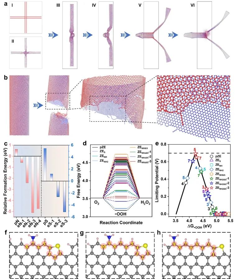 基于球磨法,本论文通过优化方案,实现了对碳纳米管端口的杂原子优先掺杂,同时很大程度上保留碳纳米管管壁的本征物理性质。因此,得到了高活性、高选择性及高稳定性的2e-ORR催化剂,实现高电流密度下H2O2的合成。图1. 碳纳米管裂解机制和端口催化位点的理论研究。(图片来源:Adv. Mater.)结合采用分子动力学模拟和实验数据,提出碳纳米管在球磨过程中的断裂机制,即缠结交叉区域的高应力集中使碳纳米管优先在交叉点断裂。“形成能”计算表明杂原子在碳纳米管端口掺杂比管壁表面掺杂更具优势,从而实现对端口碳原子局域环境的调节。采用密度泛函理论计算了关键中间体*OOH的吸附自由能,预测当氨基与噻吩硫共存时,可大幅提高催化剂对2e-ORR的选择性和催化活性,为制备高性能2e-ORR催化剂提供了理论指导 (图1)。图2. 端口掺杂碳纳米管的制备与表征。(图片来源:Adv. Mater.)
