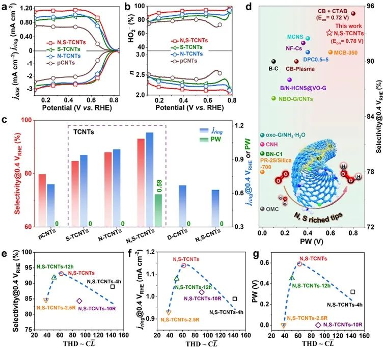 通过优化球磨工艺过程,制备具有端口优势掺杂的碳纳米管(N, S-TCNTs)。通过TEM、XPS、Raman、XRD、HR-TEM、AC-TEM(HADDF-STEM)等表征,验证碳纳米管的断裂机制,且氮、硫杂原子以吡咯氮、氨基氮与噻吩硫的形式主要掺杂于碳纳米管端口(图2)。图3. 端口掺杂碳纳米管的2e-ORR性能及其与杂原子之间关系。(图片来源:Adv. Mater.)