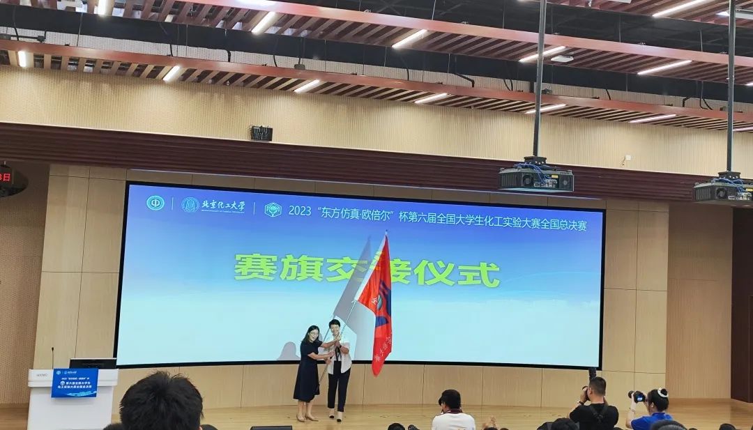 大赛赛旗由北京化工大学教务处处长刘清雅转交给天津大学化工学院副院长王军