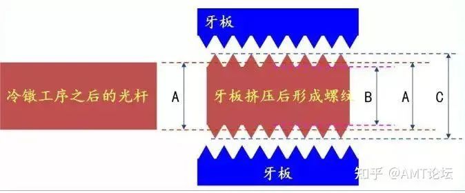 将冷镦好的坯件搓出螺纹,通过活动牙板与固定牙板的相互作用,使之牙纹成型。