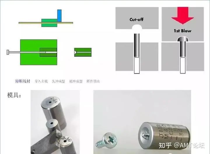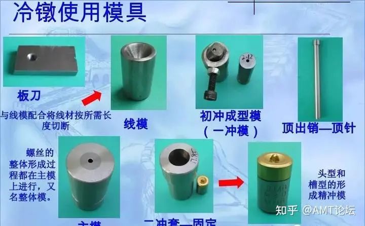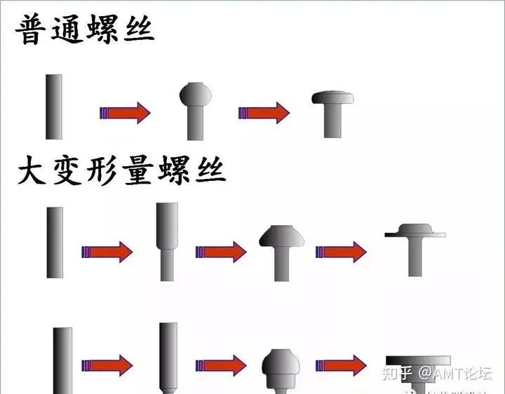 通过模具之间的相互作用,使之成型,先将线材切断,镦成螺丝坯件,形成头部,十字槽(或其它头型) 螺纹坯径及杆长,头下圆角等。