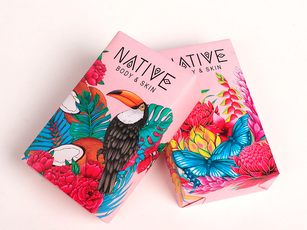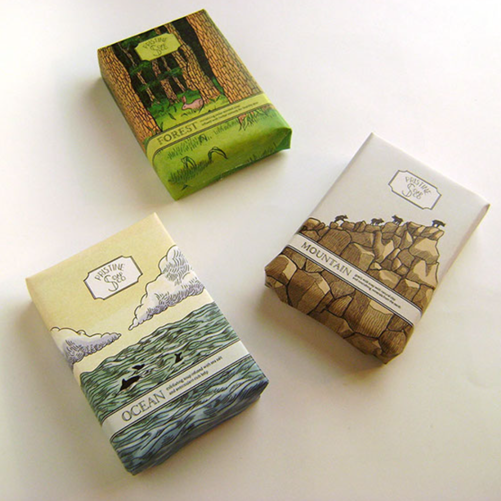 我们在前面讨论了一些受自然启发的抽象几何形状图案,但并非所有自然元素都归属于这种类别。一些香皂包装带有照片、花卉、树木和树叶的形象插图。