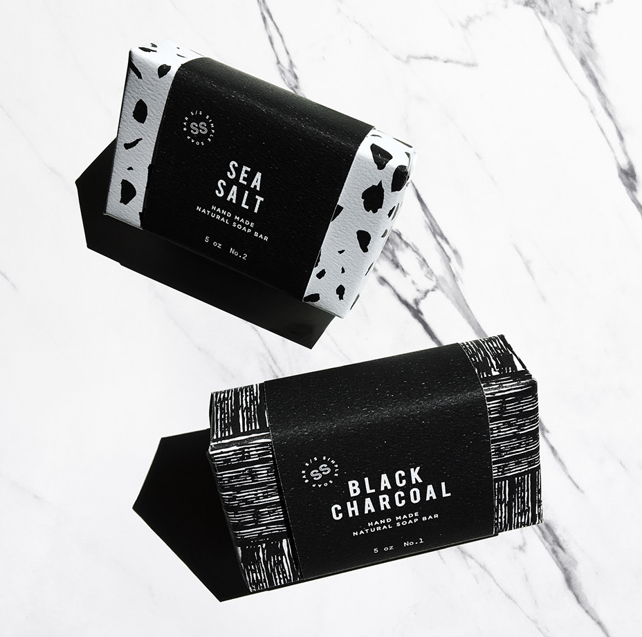 活性炭是香皂和其他自我护理产品的常用成分,如果香皂中含有活性炭,黑色包装会将这一优势放在首位和中心位置呈现出来