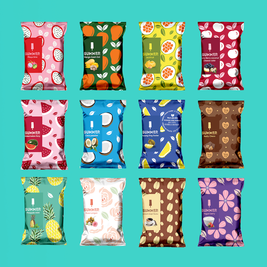 取冰淇淋的一个关键特征,无论是味道、明星成分还是品牌标志,并在包装上重复它。使用不同的配色和图案来表明您的产品系列提供的不同口味,并吸引任何爱吃甜食的路人。