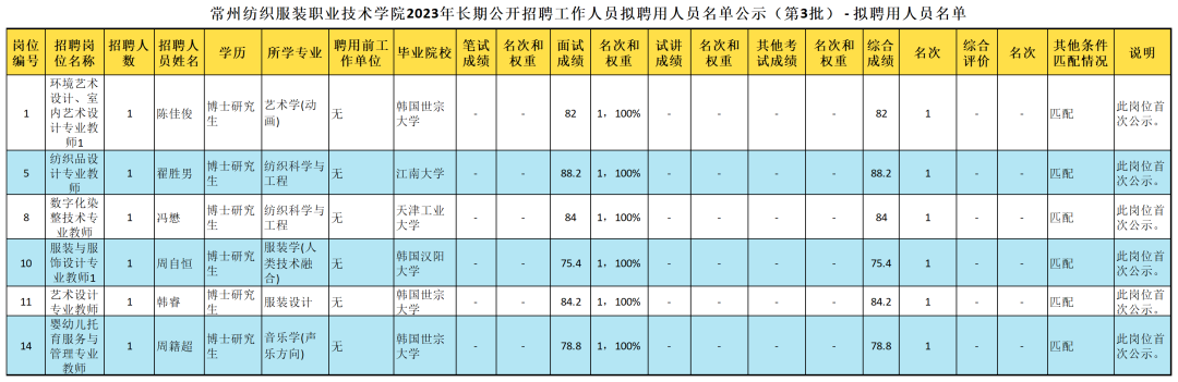 根据2023年4月19日在江苏省人力资源和社会保障厅网上发布的《常州纺织服装职业技术学院2023年长期公开招聘工作人员》的有关规定,经过面试、体检、考察等程序,确定陈佳俊等6位同志为拟聘用人员,现面向社会公示,公示期为7个工作日,自2023年8月15日起。欢迎社会各界对以上同志是否符合招聘条件进行监督。