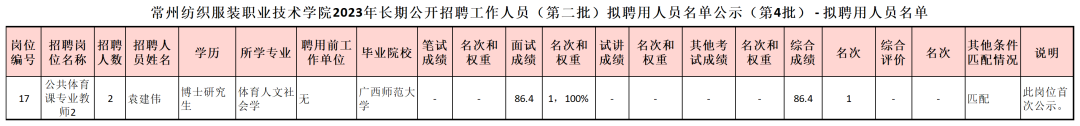 根据2023年5月9日在江苏省人力资源和社会保障厅网上发布的《常州纺织服装职业技术学院2023年长期公开招聘工作人员公告(第二批)》的有关规定,经过面试、体检、考察等程序,确定袁建伟同志为拟聘用人员,现面向社会公示,公示期为7个工作日,自2023年8月15日起。欢迎社会各界对以上同志是否符合招聘条件进行监督。